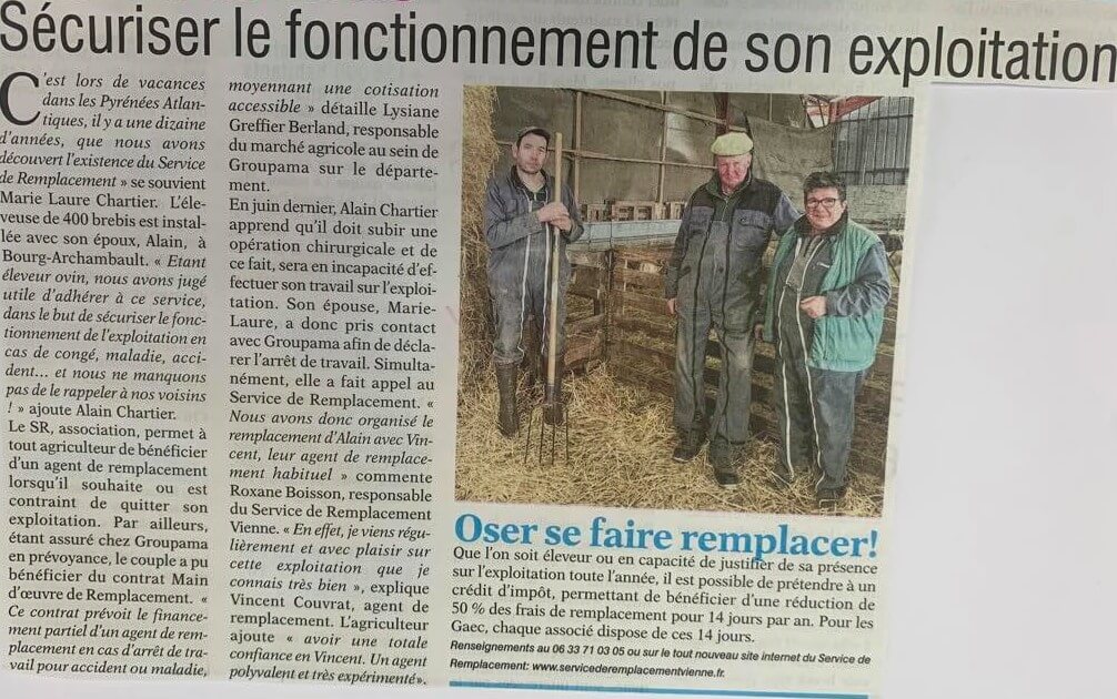 Groupama et le Service de Remplacement Vienne, depuis de nombreuses années maintenant, proposent en collaboration un contrat d'assurance.